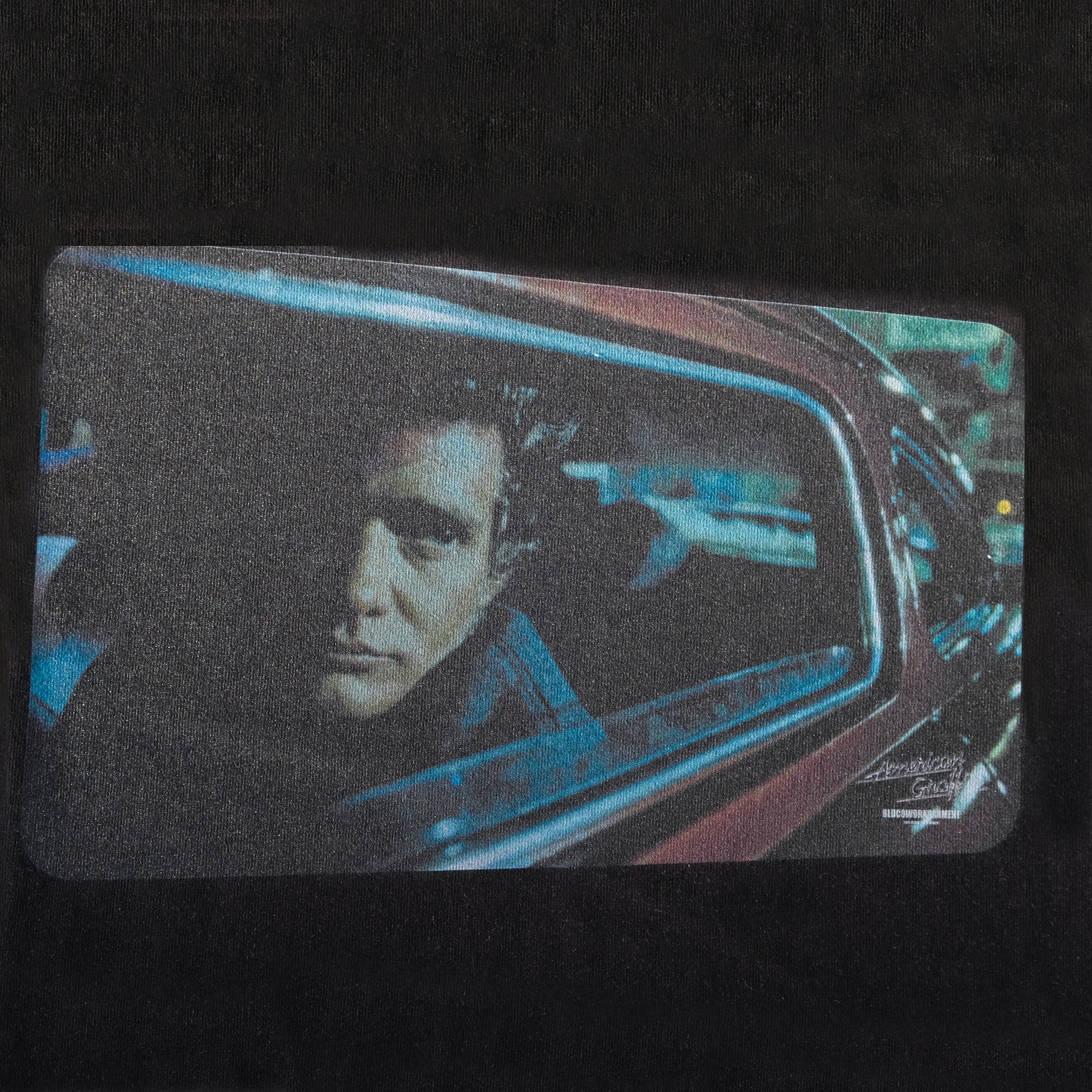 ベースには生地から製作したオリジナルの6.5oz・100%コットンボディを使用。劇中に登場する「ファラオ団」のジョー・ヤングが愛車の'51年型マーキュリーから顔を覗かせる印象的なシーンをグラフィックに落とし込んでいます。