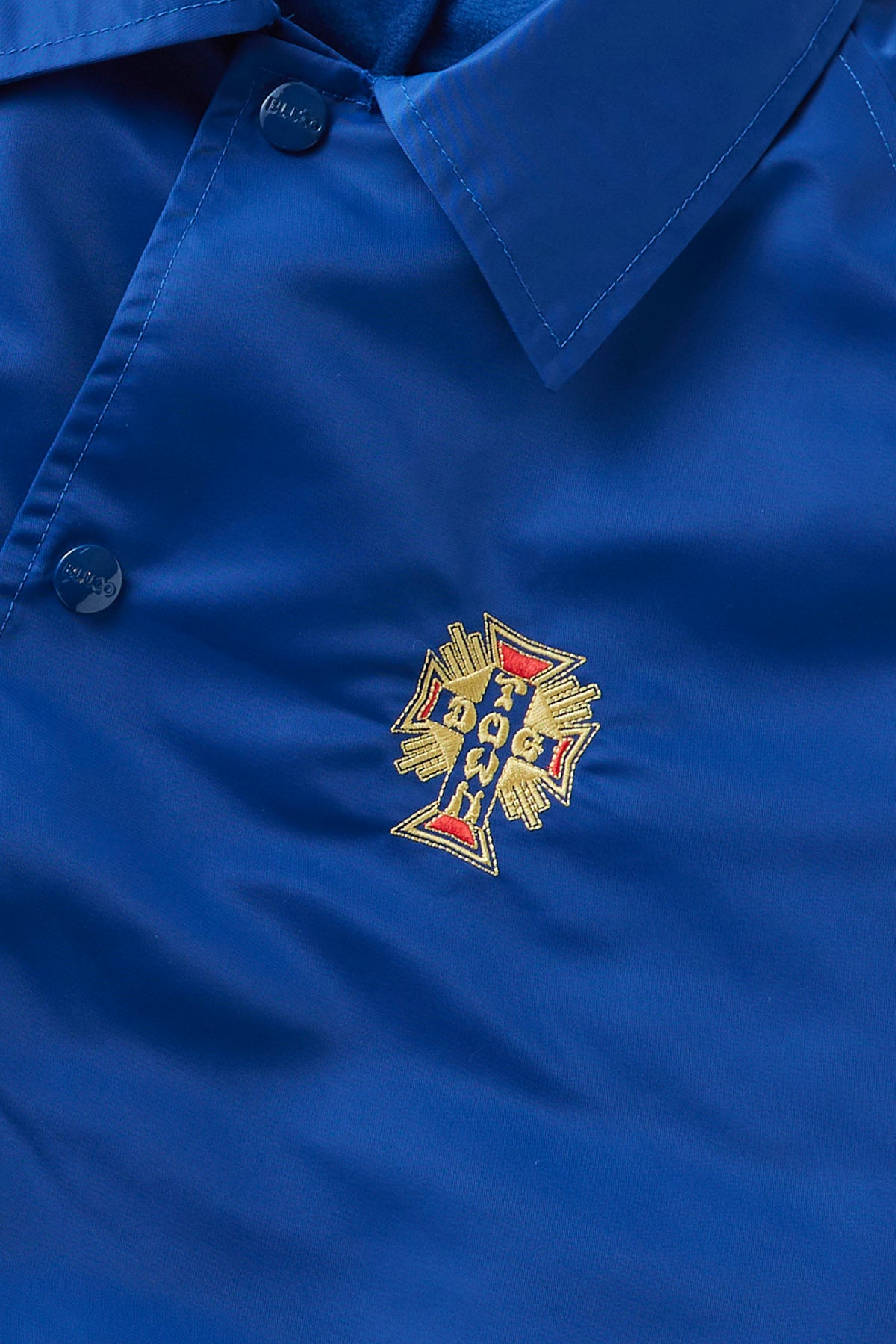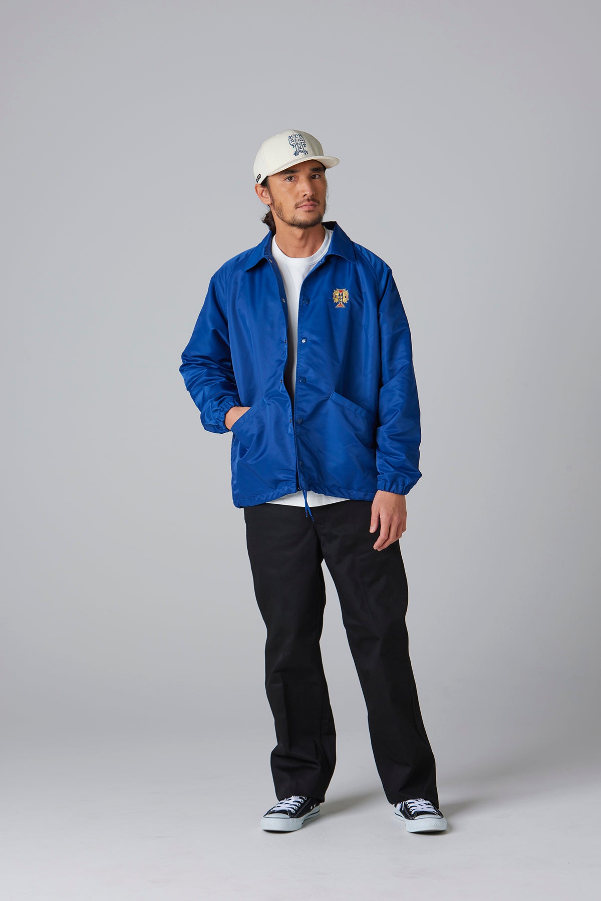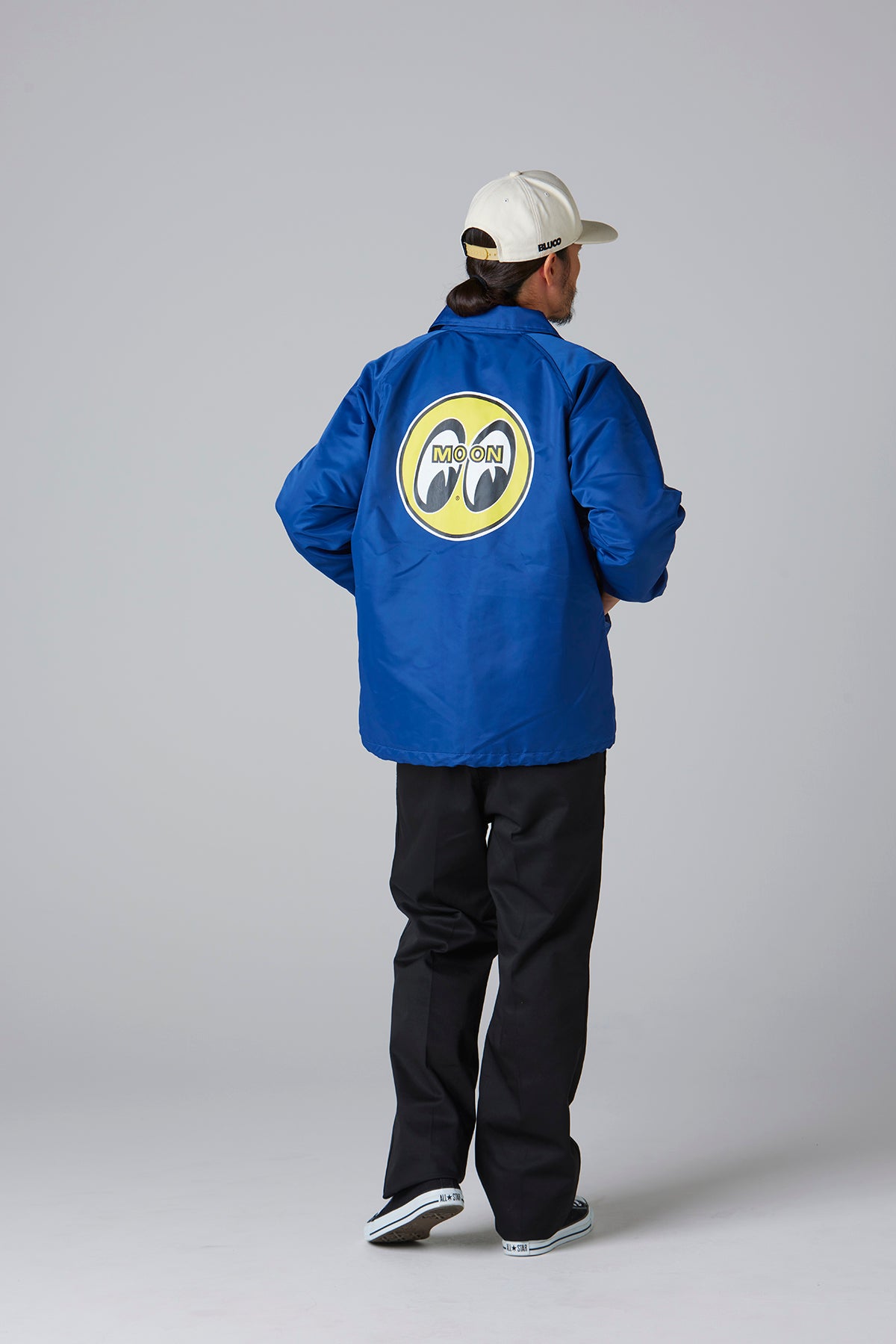 BLUCOの人気オリジナルコーチジャケットに、DOGTOWNのエンブレム刺繍とMOONEYESパッチをあしらった、特別仕様のトリプルコラボレーションアイテム。
