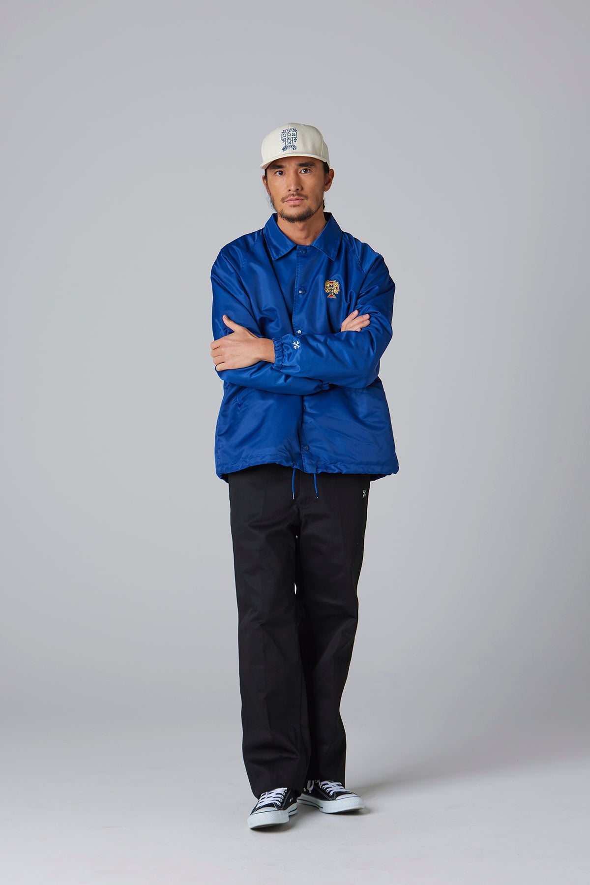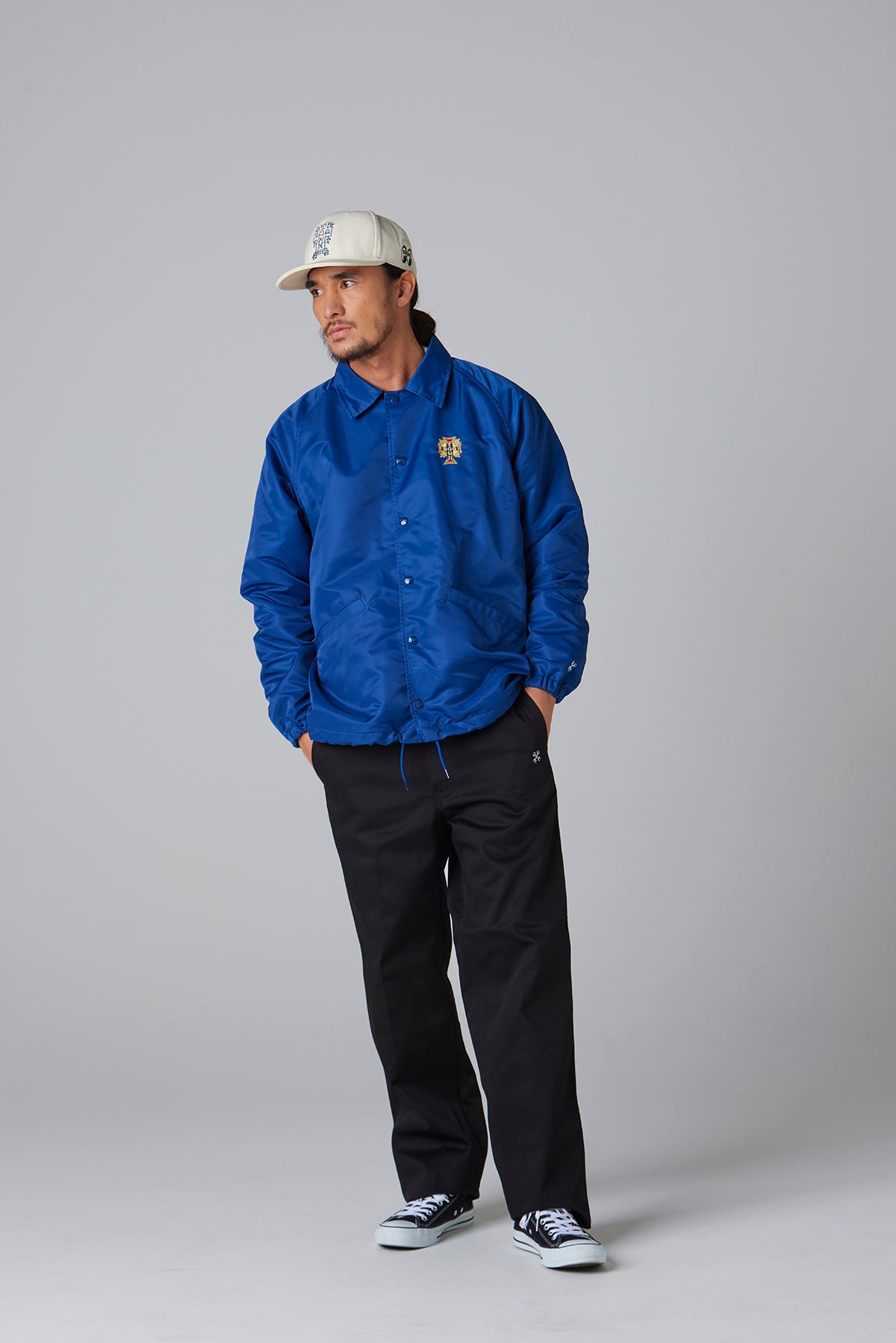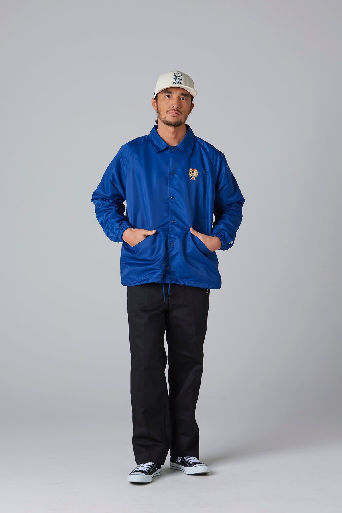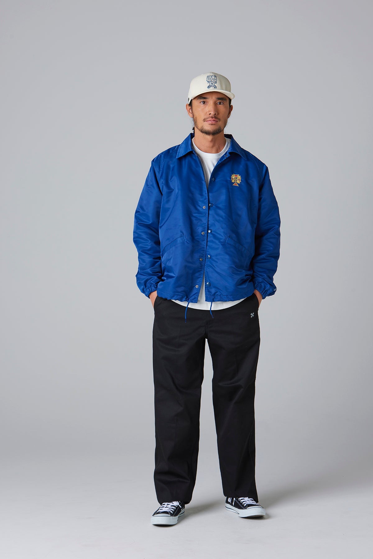 BLUCOの人気オリジナルコーチジャケットに、DOGTOWNのエンブレム刺繍とMOONEYESパッチをあしらった、特別仕様のトリプルコラボレーションアイテム。